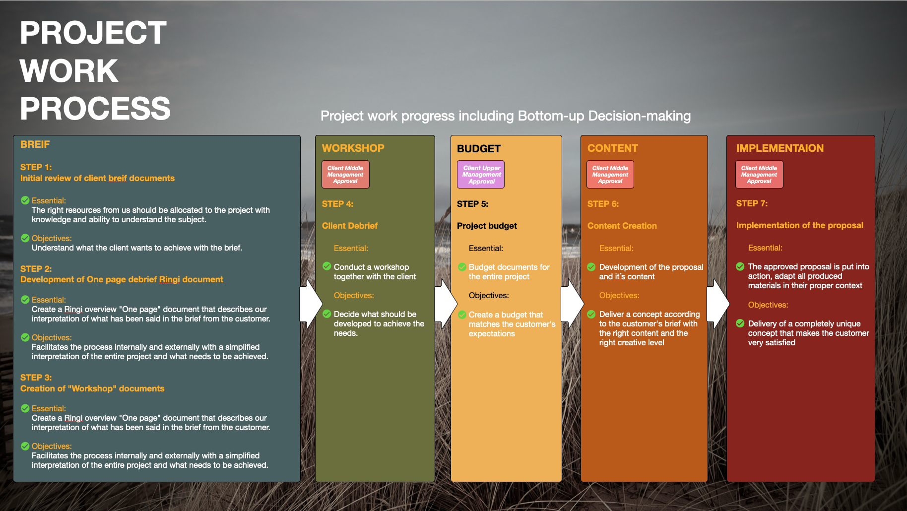 We work with the Ringi methodology and the Kaizen principle to create continuous control, anchored decisions and continuous improvement in every project. By interpreting strategy from the company's origins and connecting it to the right financial and organizational decisions, we ensure that every delivery reflects the true essence of the brand - both commercially and experientially.